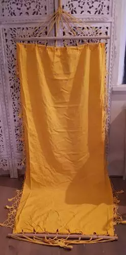Amaca con telo in cotone, frange laterali di finitura e bastoni in legno.