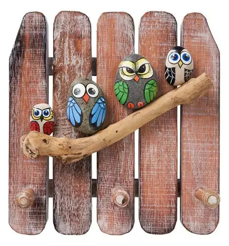 Simpatico e originale appendiabiti da parete con civette colorate in legno naturale e pietra decorata, ideale per l'ingresso per chiavi borse sciarpe e giacche, la cucina come porta asciugapiatti e grembiuli e portabiti per la camera dei ragazzi.