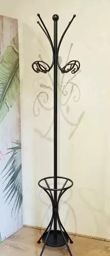 Appendiabiti da terra con port ombrelli in ferro battuto nero.