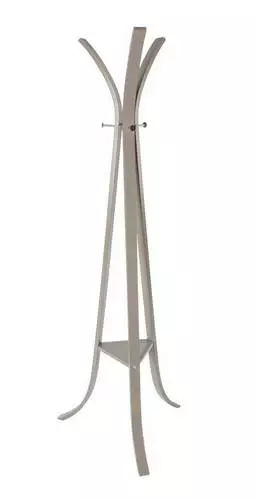 Appendiabiti a piantana da terra in stile moderno realizzato in legno multistrato di betulla laccato grigio tortora con appendini in acciaio cromato.