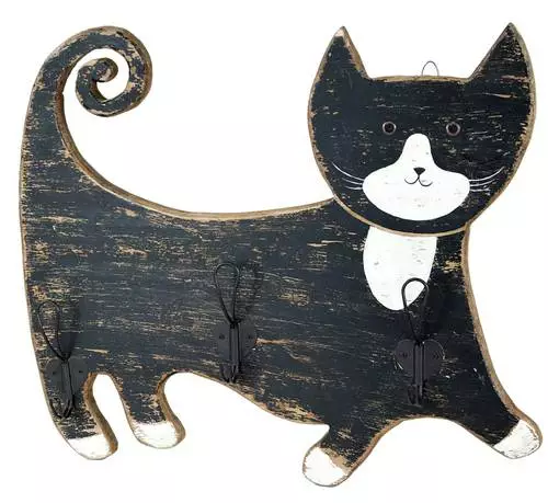 Appendiabiti da parete realizzato in legno con sagoma del gatto nero, finitura del colore in stile shabby.