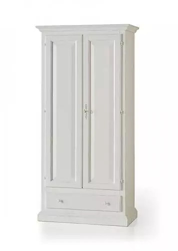 Armadio in legno di betulla laccato bianco opaco, strutturato con due ante e un cassetto, bastone interno appendiabiti.