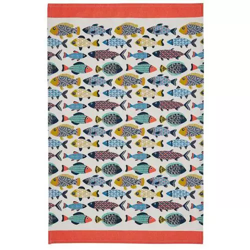 Asciugapiatti in 100% cotone a marchio Ulster Weavers della collezione Aquarium, design ispirato a sdraio e teli mare, ricordi di vacanze al mare, pesci colorati che nuotano in una meravigliosa barriera corallina.