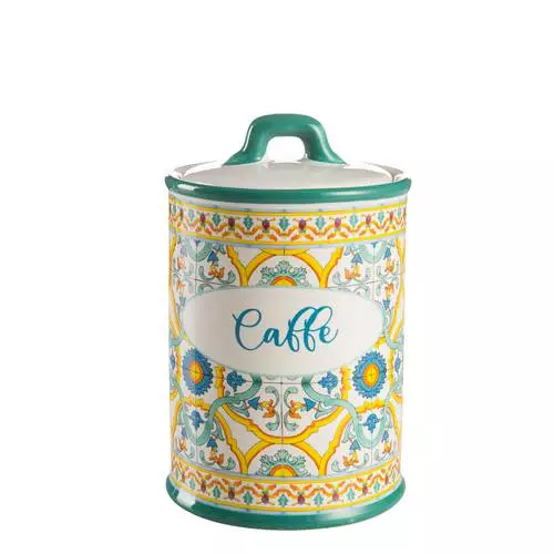 Barattolo da cucina per il caffe’ con chiusura ermetica, in ceramica colorata con decorazioni ispirate alla Sicilia e al Mediterraneo.