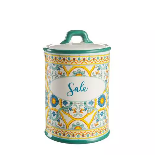 Barattolo da cucina per il sale con chiusura ermetica, in ceramica colorata con decorazioni ispirate alla Sicilia e al Mediterraneo.