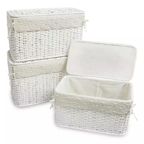 Baule intrecciato in bamboo colore bianco con fodera in cotone con applicazione perle.