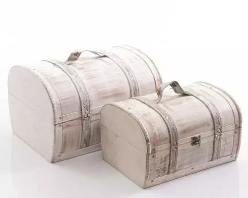 Scatola a bauletto in legno sbiancato effetto shabby, cinghie di finitura in ecopelle e chiusura in metallo.