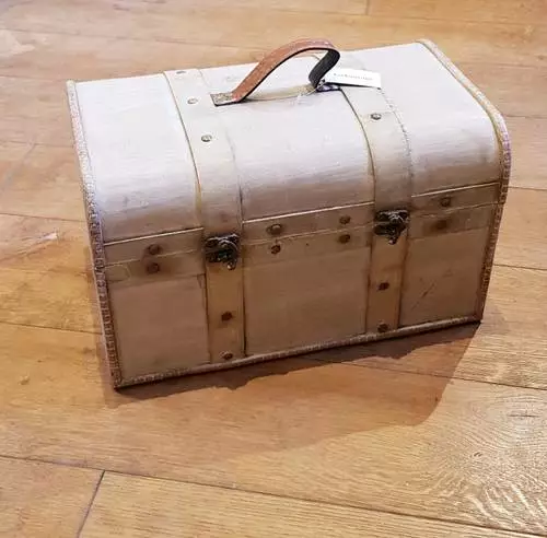 Scatola bauletto in legno sbiancato effetto shabby, maniglia e cinghie in ecopelle e chiusura in metallo.