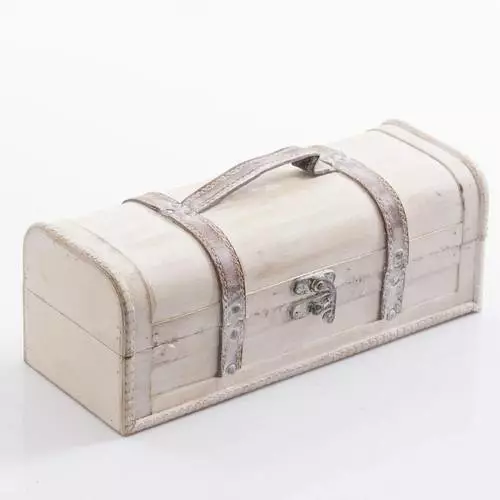 Scatola bauletto in legno sbiancato effetto shabby, maniglia in ecopelle e e chiusura in metallo.
