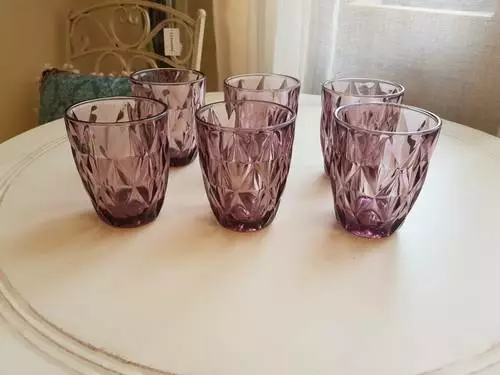 Completo 6 bicchieri da acqua in vetro con lavorazione a rilievo a rombi. Pasta di vetro colorata resistente e spessa, lavabile in lavastoviglie.