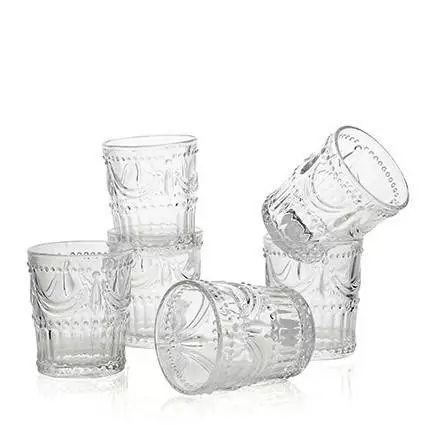 Confezione di 6 bicchieri acqua in vetro trasparente con disegni a rilievo.