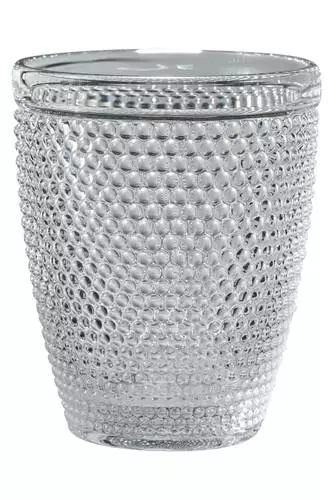 Completo 6 bicchieri di vetro da acqua con lavorazione a rilievo a pallini. Pasta di vetro resistente e spessa, lavabile in lavastoviglie.