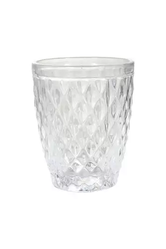 Completo 6 bicchieri di vetro da acqua con lavorazione a rilievo a rombi. Pasta di vetro colorata resistente e spessa, lavabile in lavastoviglie.