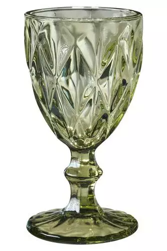Completo 6 calici di vetro con lavorazione a rilievo a rombi. Pasta di vetro colorata resistente e spessa, lavabile in lavastoviglie.