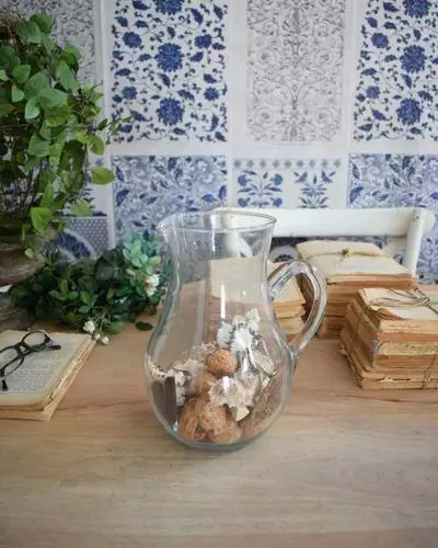 Brocca da tavola per acqua in vetro dalla forma bombata con manico, capacità 200 ml, lavabile in lavastoviglie.