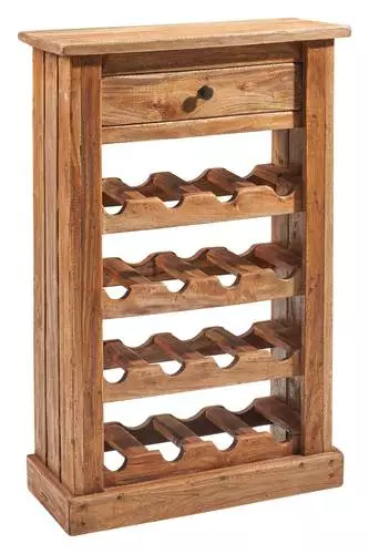 Mobile cantinetta portabottiglie da 16 posti con cassetto realizzato in legno riciclato colore naturale in stile vintage.