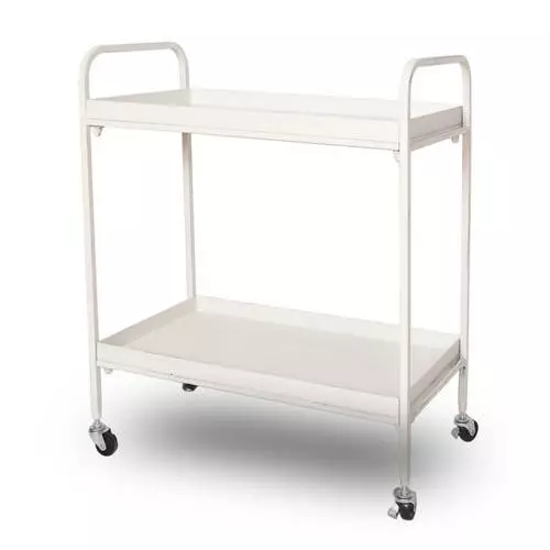 Carrelo da cucina realizzato in metallo bianco, due piani, con ruote.