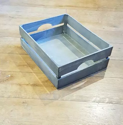 Cassetta in legno di abete grigio con finitura effetto shabby con pratiche maniglie.
