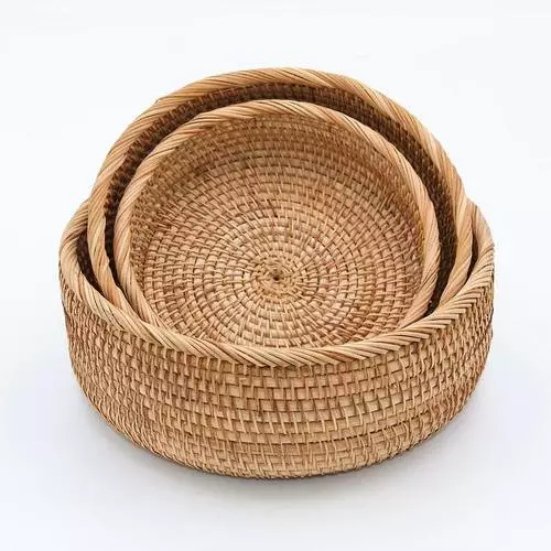 Cesto tondo intrecciato in fili di rattan. Disponibile in tre dimensioni.