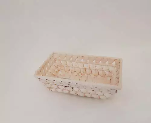 Cestino rettangolare intrecciato in foglie di palma con lavorazione traforata.