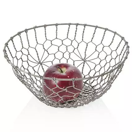 Cestino realizzato in filo di metallo grigio intrecciato.