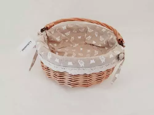 Cestino tondo intrecciato in vimini naturale con manico pieghevole.