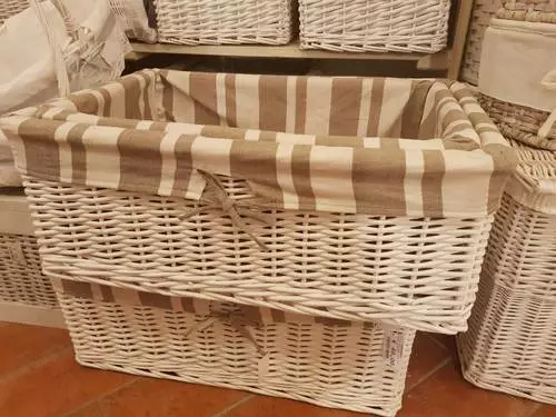 Cesto formato rettangolare intrecciato in vimini grigio con fodera in cotone estraibile.
