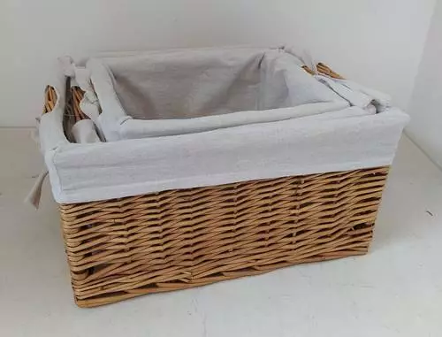 Cesto dal formato rettangolare intrecciato in vimini naturale con fodera in cotone estraibile.