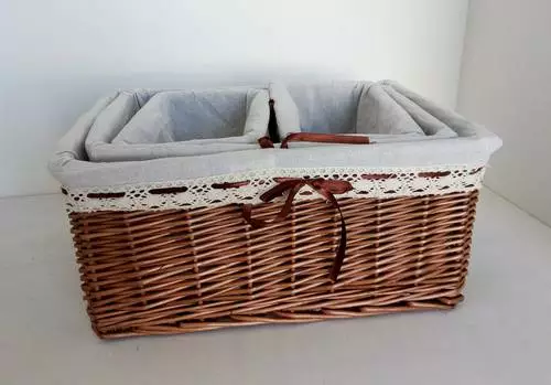 Cesto dal formato rettangolare intrecciato in vimini ncolore moce con fodera in cotone estraibile bordata da merletto.