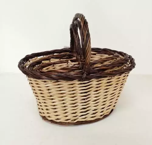 Cesto intrecciato in vimini rustico con manico.