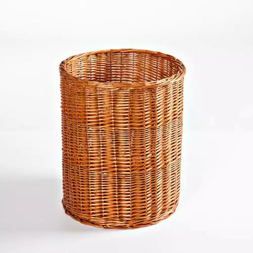 Cesto dalla forma a cilindro intrecciato in vimini rosso.