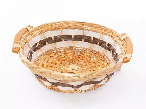 Cesto tondo in vimini natuarle fascia bbicolore marrone-bianca con maniglie legno.