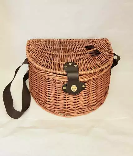 Cesto in vimini naturale per la raccolta dei funghi dalla forma stondata a mezzaluna con tracolla regolabile in tessuto, chiusura e maniglia in ecopelle.