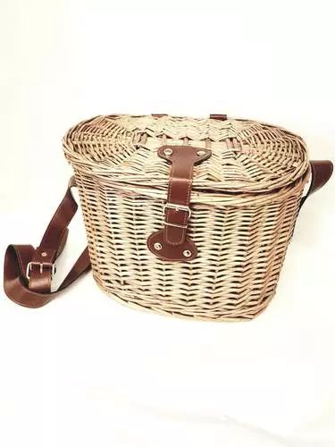 Cesto in vimini naturale per funghi dalla forma ovale con tracolla regolabile in ecopelle e chiusura.