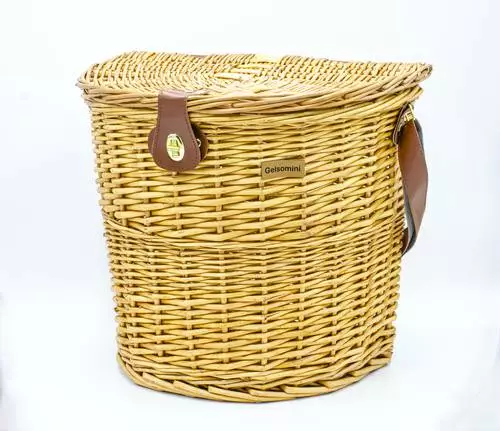 Cesto intrecciato in vimini naturale per funghi, mirtilli, castagne e tutti i frutti del bosco, con pratica con tracolla in ecopelle regolabile, coperchio con possibilità di chiusura con cinturino, forma mezza tonda comoda da indossare che facilita le operazione di raccolta e le lunghe camminate.