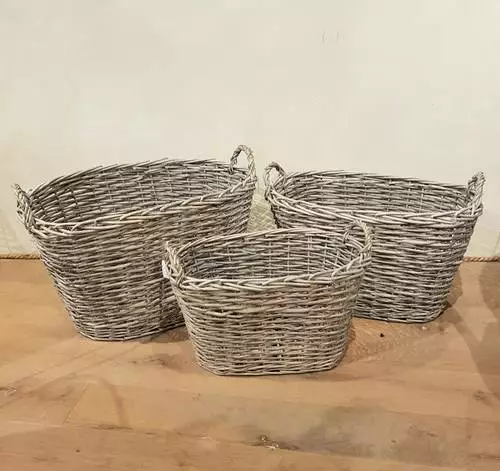 Cesto in vimini grigio dalla forma ovale con pratici manici, ideale come portalegna e portagiocattoli, per arredare la casa in stile vintage.