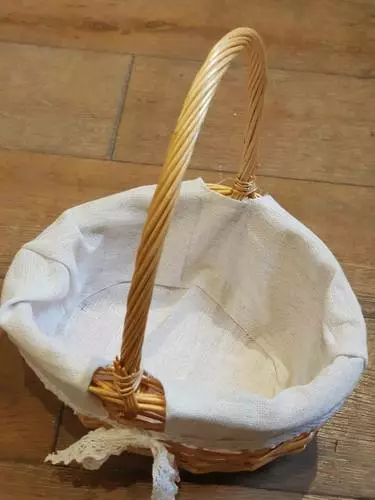 Cesto ovale con manico in vimini naturale con fodera estraibile in cotone con bordo pizzo.