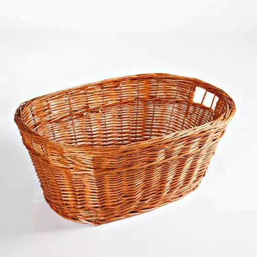 Cesto ovale con maniglie incassate intrecciato in vimini rosso.
