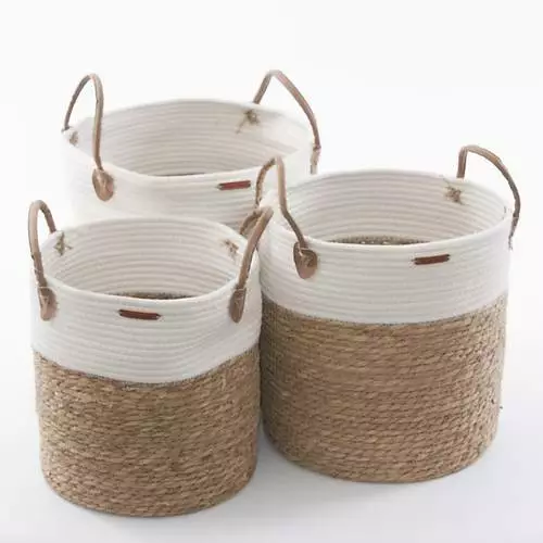 Cesto tondo intrecciato in paglia di seagress con finiture decorative e manici in corda di cotone bianca, pratico contenitore raccogli cose per giocattoli, riviste, plaid, cestone d'arredo coprivaso per piante da appartamento.