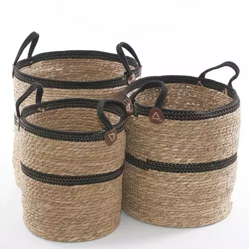 Cesto tondo intrecciato in paglia di seagress con finiture decorative e manici in corda di cotone nero, pratico contenitore raccogli cose per giocattoli, riviste, plaid, cestone d'arredo coprivaso per piante da appartamento.