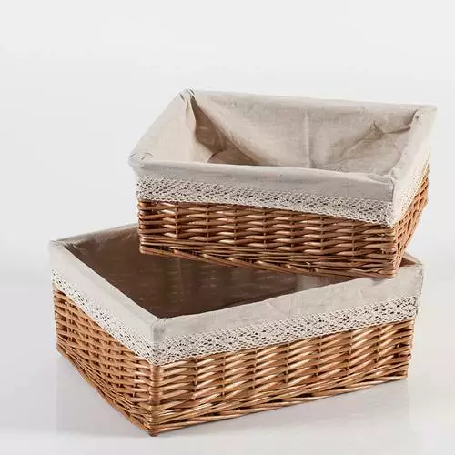Cesto formato rettangolare intrecciato in vimini naturale, fodera in cotone estraibile con applicazione di merletto di finitura, contenitore multiuso da riponimento e per armadio.