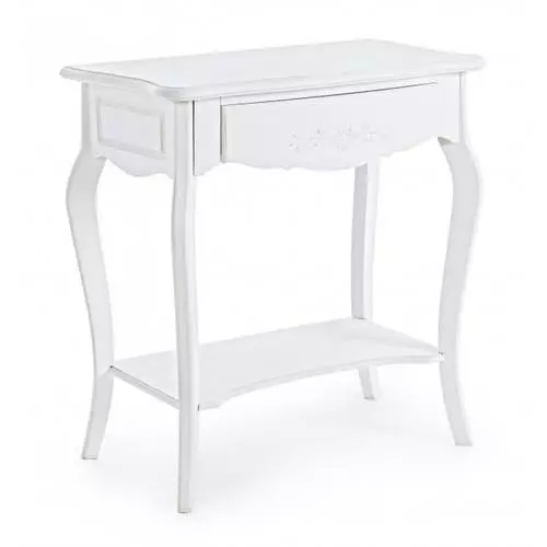 Consolle con cassetto e ripiano in legno di abete verniciato bianco opaco.