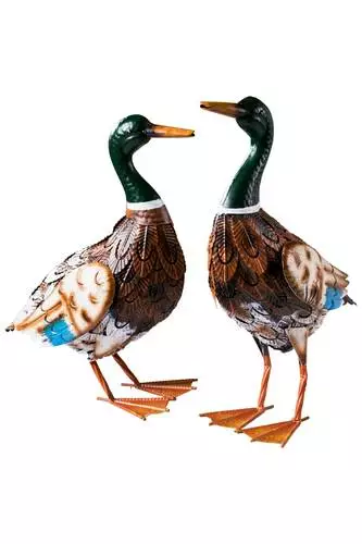 Coppia di anatre da giardino maschio e femmina in ferro con lavorazione artiginale dipinto a mano.