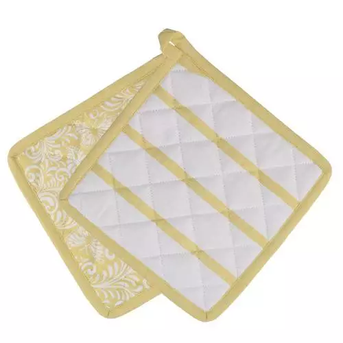 Coppia di prendipentole da cucina tradizionali dalla forma quadrata in cotone colorato Materiale: 100% cotone esterno, imbottitura in poliestere. Istruzioni per la cura del prodotto: lavare in lavatrice a 40°, non candeggiare.