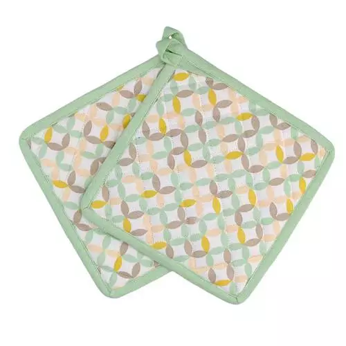 Coppia di prendipentole da cucina tradizionali dalla forma quadrata in cotone colorato Materiale: 100% cotone esterno, imbottitura in poliestere. Istruzioni per la cura del prodotto: lavare in lavatrice a 40°, non candeggiare.