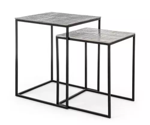 Completo di due tavolini per l'angolo salotto con piano in alluminio anticato colore argento, struttura in acciaio verniciato colore nero.