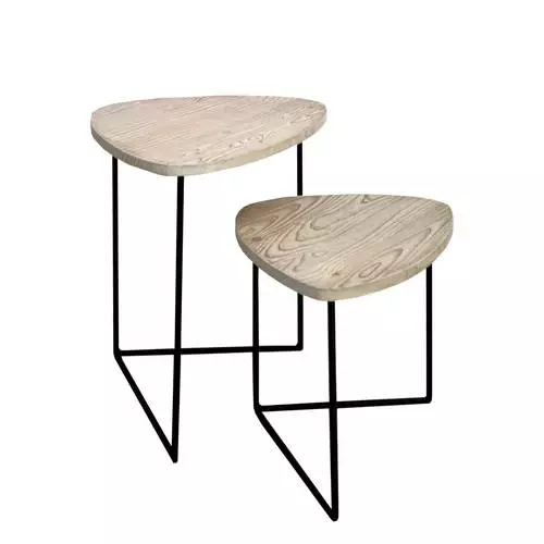 Tavolini in coppia da salotto dalla forma triangolare con piano in legno di abete spazzolato e struttura portante in ferro nero.
