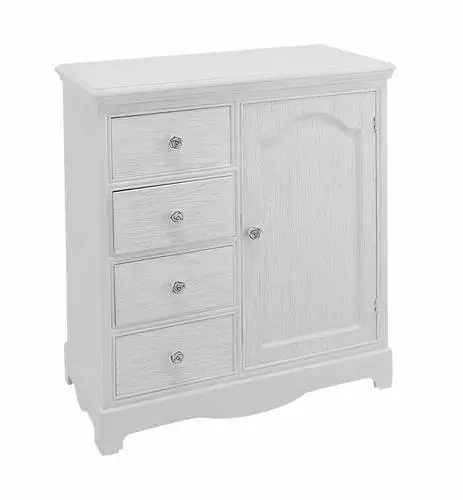 Credenza con 1 anta e 4 cassetti in legno di pino verniciato in bianco-crema con effetto decapato, pomoli aforma di rosellina.