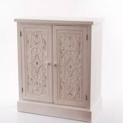 Piccola credenza con due ante in legno bianco dalla finitura anticata shabby, parte frontale in legno intagliato a motivi floreali. Mobile versatile, piccolo, ma capiente, con ripiano interno, ideale per ogni angolo della casa, ingresso, bagno, cucina, soggiorno, e camerette.