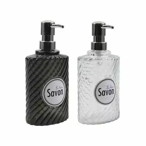 Dispneser per sapone liquido in vetro con erogatore in metallo satinato in stile vintage con scritta Savon, disponibile in due colori.